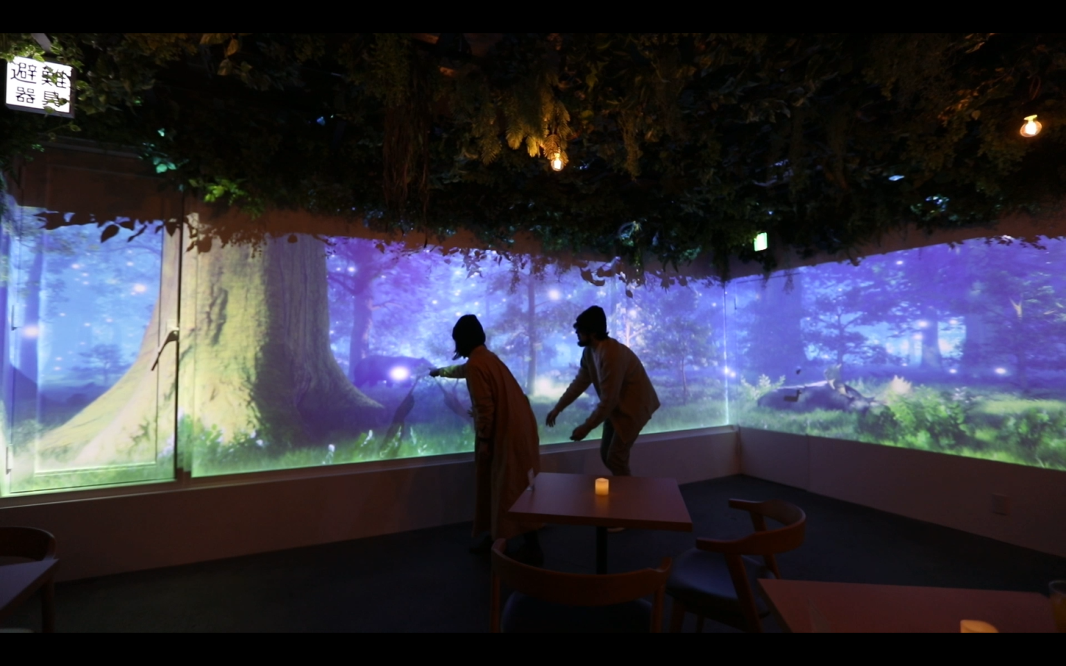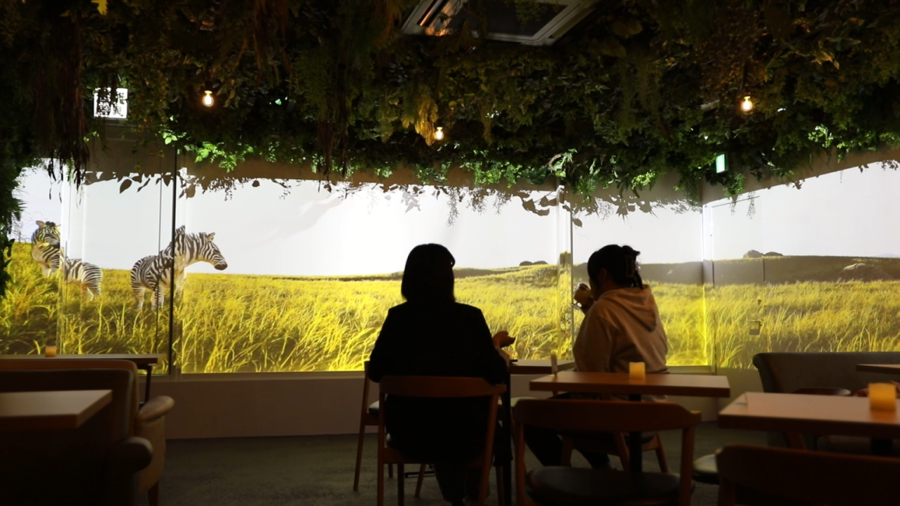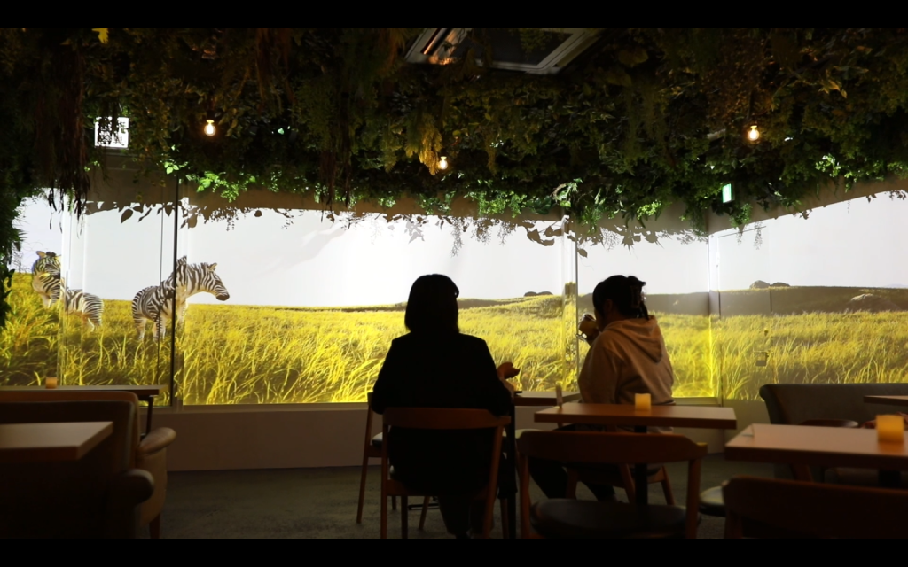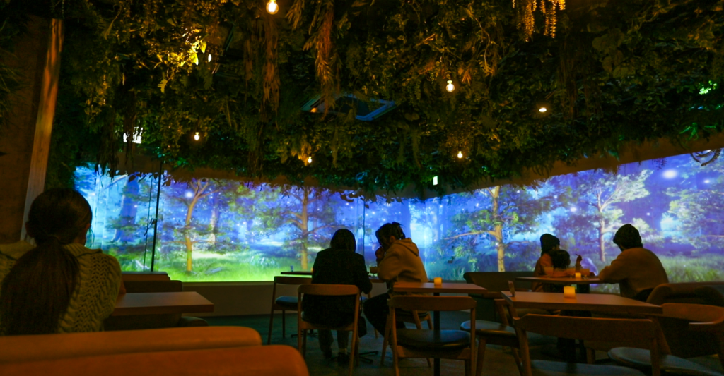 数十平米のカフェ空間を対象に、自然をテーマにしたオリジナルの映像と音響で“森の中に迷い込んだような没入空間”を演出。昼と夜で映像が変化するなど、訪れるたびに新しい体験ができる設計としました。