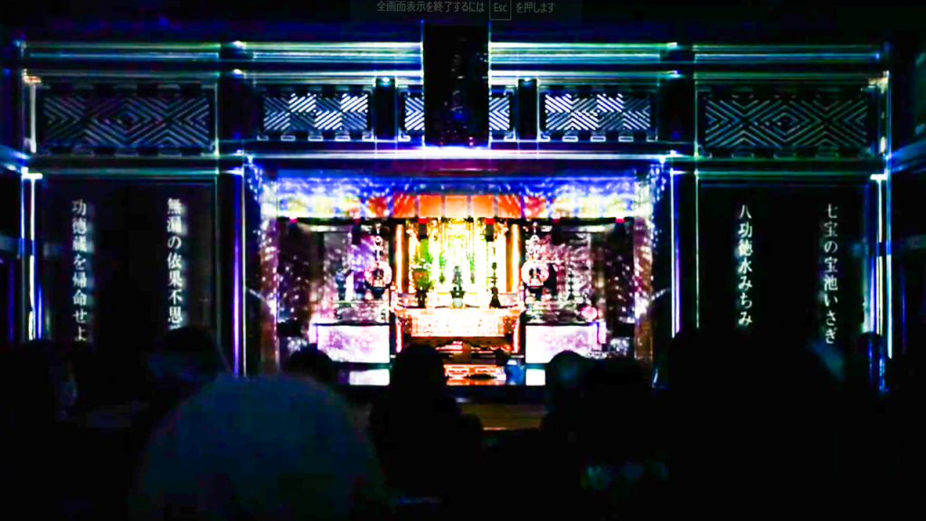 - 参加者全員で念仏を唱える場面では、念仏のリズムやボリュームに応じて映像がリアルタイムで変化するインタラクティブなシステムを導入