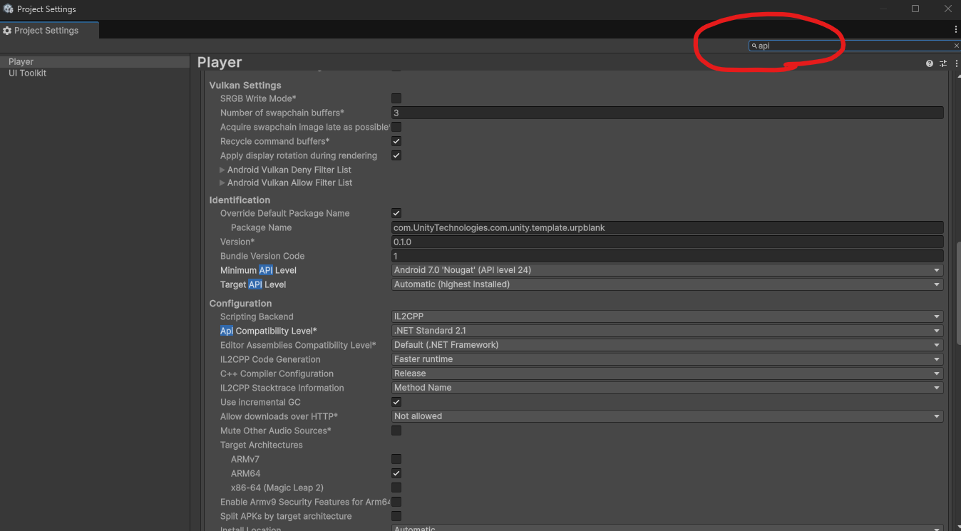 - Other Settings > Minimum API LevelをAndroid 7.0 (API level 24) 以上に設定。